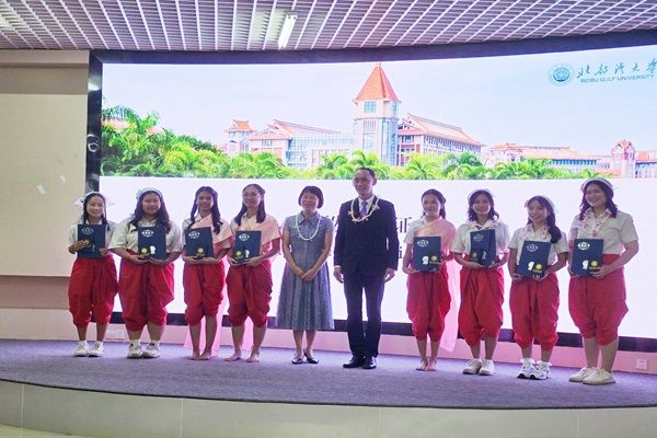 6 月 26 日结营仪式上,泰国学生展现中文歌曲、中华经典诵读展示学习成果,获阵阵掌声。双方互赠纪念品、颁发结业证书。北部湾大学校党委常务、副校长陆衡、泰国班颂德昭帕亚大学副校长帕拉迪颂一行,以及中泰师生一同参加结营仪式。