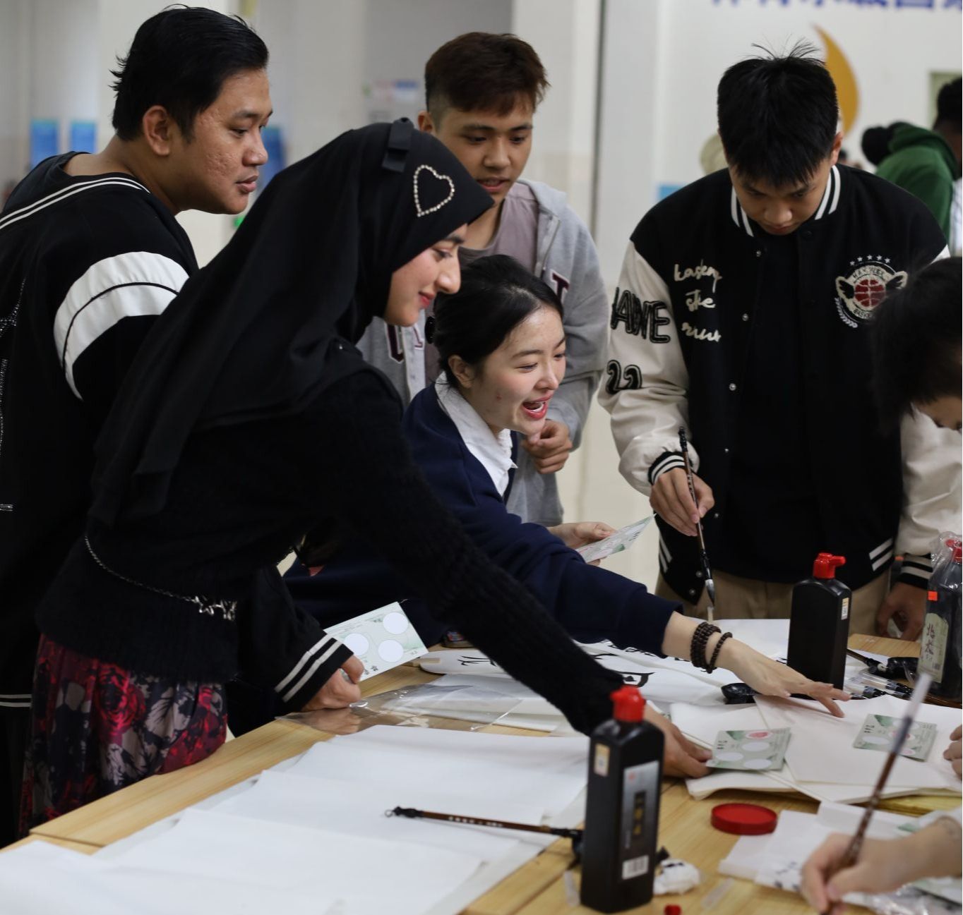 本次活动以冬至节气为文化切入点,创新采用集章打卡的趣味形式,精心设置书法、剪纸、漆扇、投壶四大非遗体验区。活动现场,留学生们手持专属集章卡,在老师和志愿者指导下挥毫泼墨临摹汉字,巧手裁剪窗花剪纸,调配漆料制作扇面,体验古代文人雅士的投壶竞技。现场人头攒动、笑语盈盈,浓郁的文化氛围与热闹的互动气息交融,成为校园里一道独具韵味的风景线。